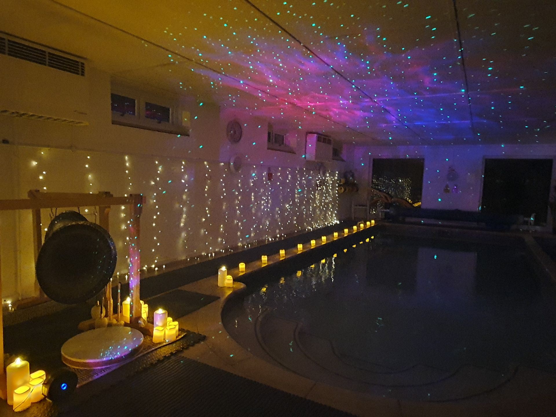 Not only does water make a perfect medium for sound + intensifies the vibrations & frequencies, the acoustics of the swimming pool intensifies this further.
